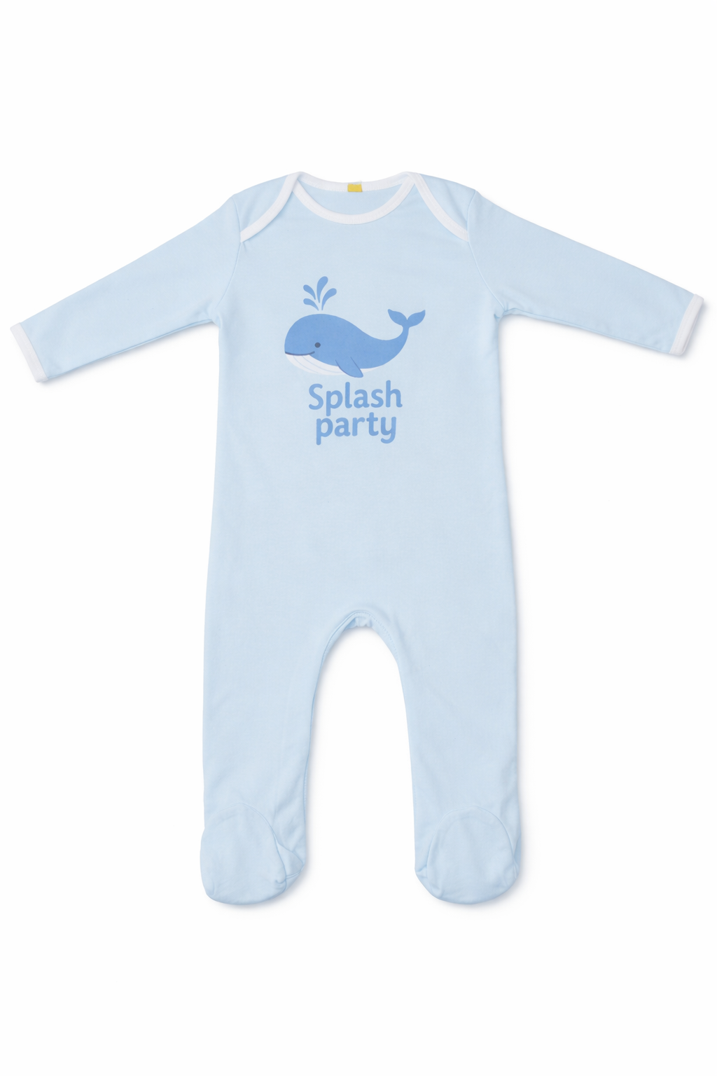 Ce pyjama bleu en coton certifié OEKO-TEX® garantit confort, douceur et sécurité. Son motif “Splash Party” apporte une touche joyeuse, et ses pressions au dos facilitent l’habillage au quotidien.